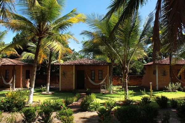 Amplos chalés para solteiro, casal e triplo, com ar refrigerado, frigobar, ducha quente e café da manhã incluso na diária.