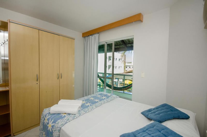 Apartamentos completos com cozinha, sala, quarto, banheiro, ar condicionado e churrasqueira.