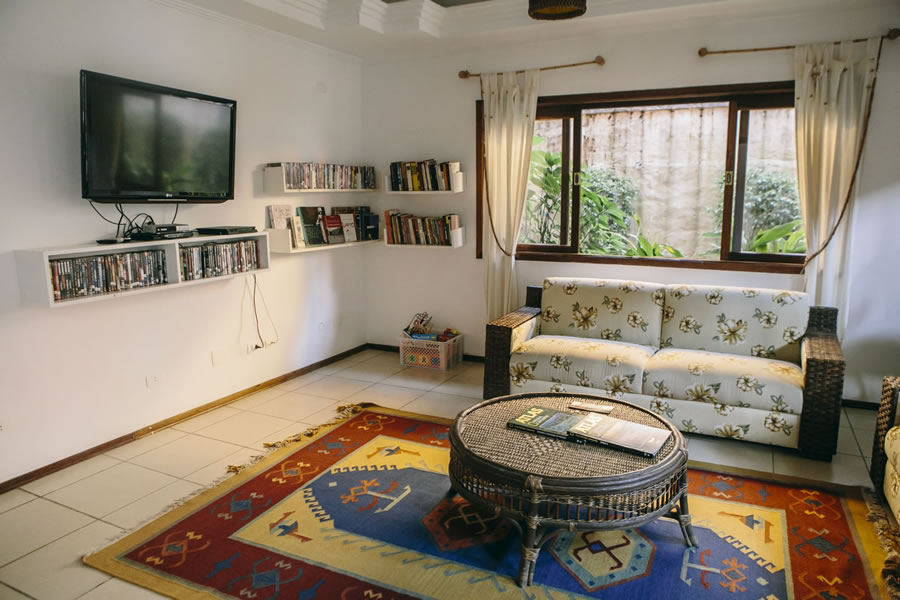 A piscina é uma graça e convidativa, também me surpreendeu a sala de vídeo com dezenas de títulos disponíveis para os hospedes, além de um videogame para a garotada, mas uma forma de entretenimento.
